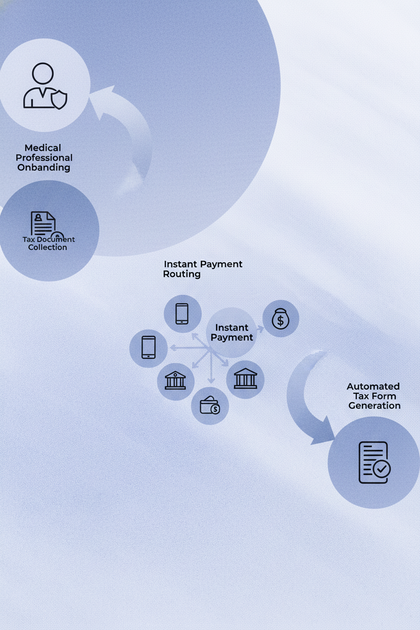 The right solution handles W-9 and I-9 collection, verifies credentials, routes payments through ACH or instant rails, and generates year-end tax forms. For locum tenens agencies placing physicians across state lines, the system must also handle multi-state tax withholding and international payouts.