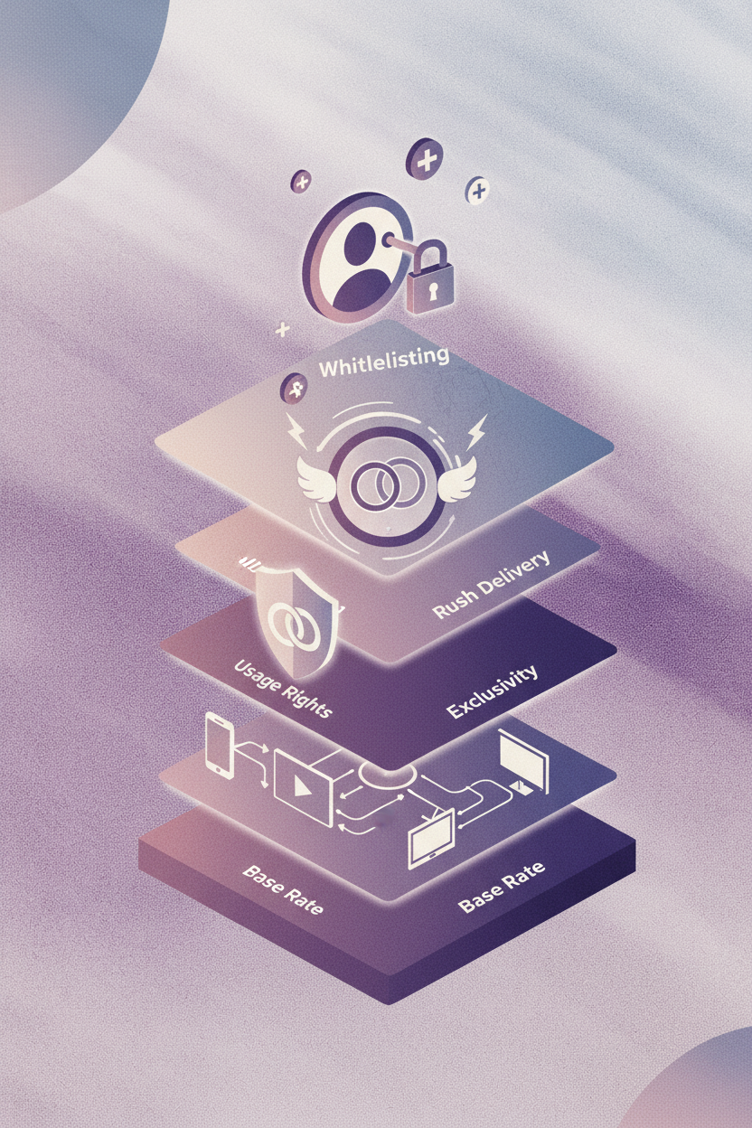 Usage rights for repurposing content in ads add 20% to 50% to base rates, exclusivity clauses demand premium compensation, and whitelisting to run ads through a creator's profile incurs extra charges. Plan for these upfront to avoid budget overruns.